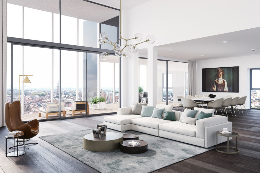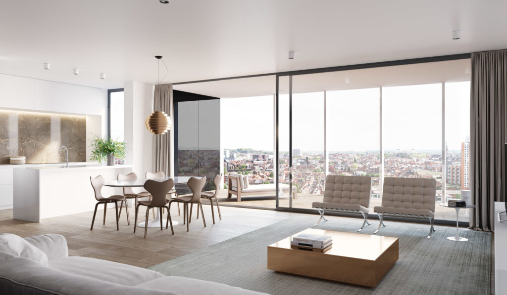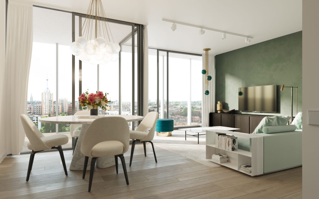 Met hun extra hoge plafonds, grote glaspartijen van vloer tot plafond en glazen borstweringen op het terras voelen de appartementen buitengewoon open aan en is het daglicht alom aanwezig.