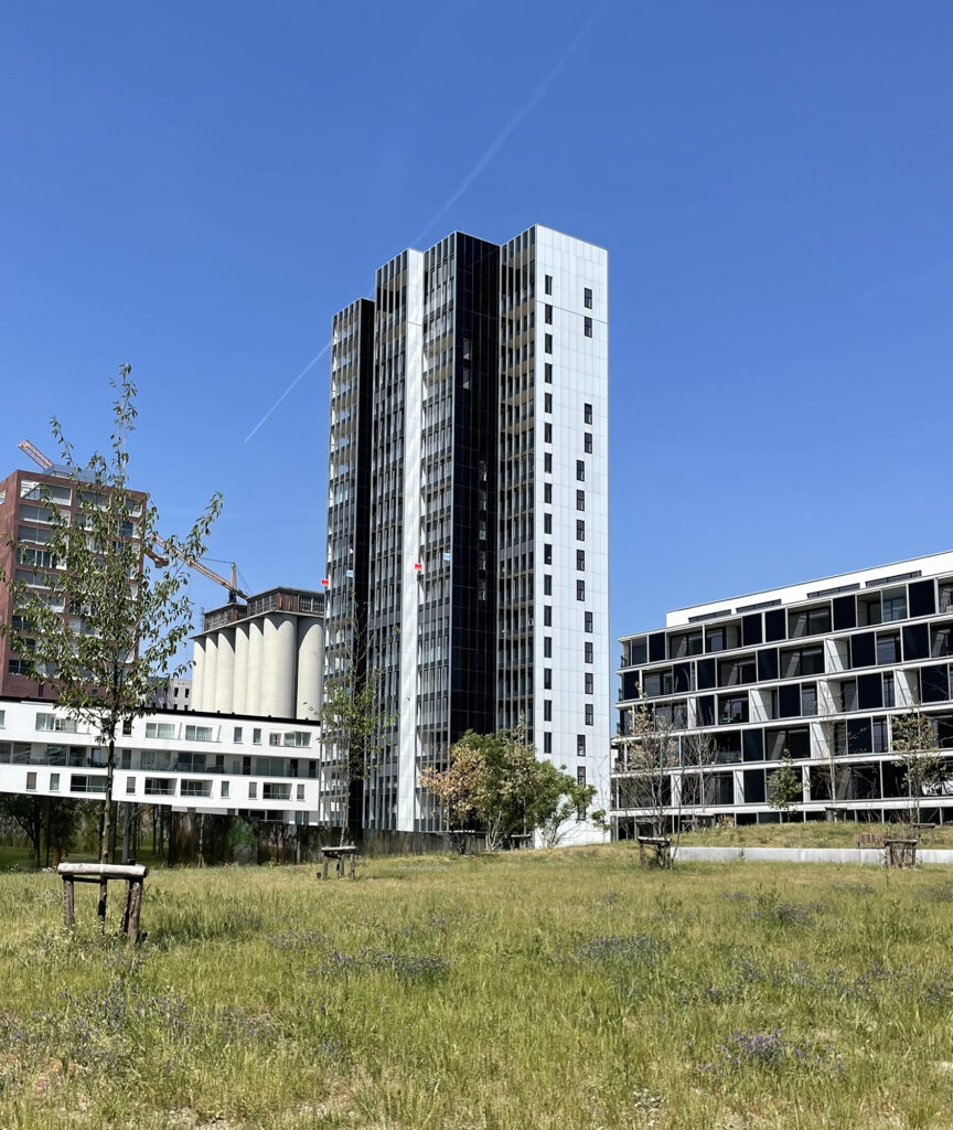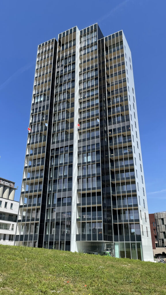 De woontoren is volledig opgesplitst in vier volumes die naar voor of achter zijn geschoven, wat niet alleen voor een zekere ritmiek zorgt maar ook meer uitzichten garandeert voor de bewoners. Die genieten op het terras en in de woonruimte van een fenomenaal uitzucht over het centrum van Leuven, en achteraan in de slaapkamers over de Vaartkom.